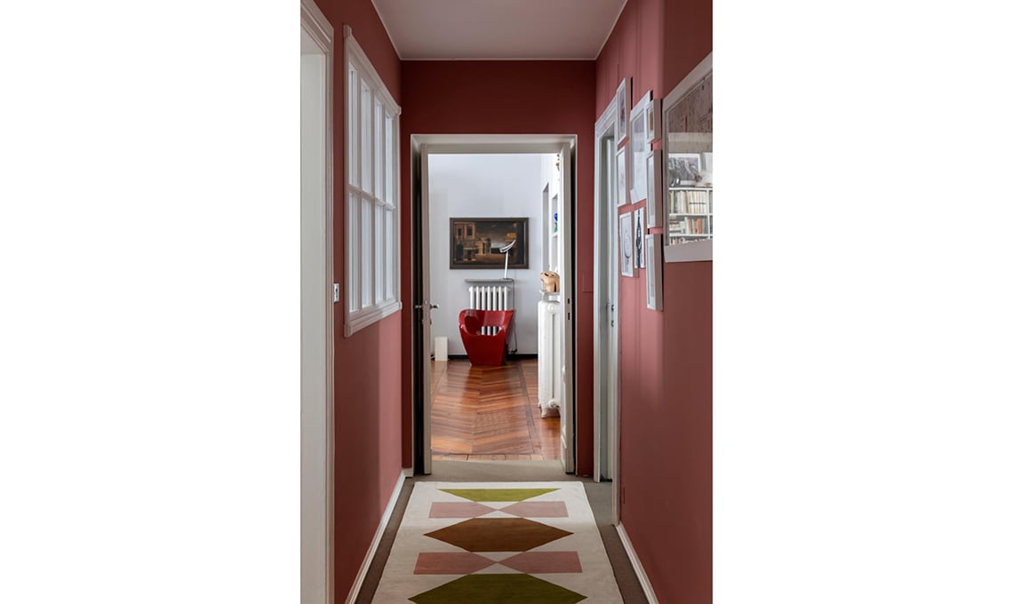 La vetrata ricavata nella parete dello studio ha aggiunto luce al corridoio e una nuova vista sulla casa. L’apertura è stata fatta della misura di una vetrata vintage trovata da Clara da un rigattiere. Passatoia della coll. Relazioni disegnata da Clara Bona [Alberto Levi Gallery].