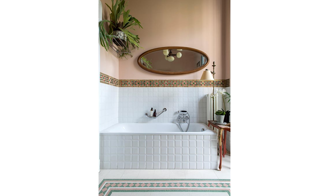 vita. Basta cambiare piccole cose come tessuti, cuscini e colori, e la casa si trasformerà totalmente senza spese eccessive» è il consiglio pratico che ci dà Clara. Specchio ovale vintage acquistato al mercatino di Camden Town a Londra. piastrelle quadrate diamantate