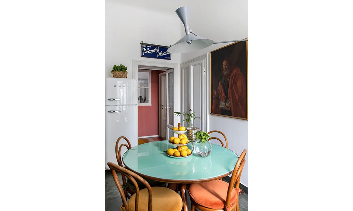 Frigo dalle linee Anni ’50 [Smeg, cm 60x72x172h]. sedie [Thonet], lampada Lampe de Marseille da parete, design di Le Corbusier [Nemo Lighting, ø cm 50], insegna vintage in metallo acquistata al mercatino di Brick Lane a Londra.