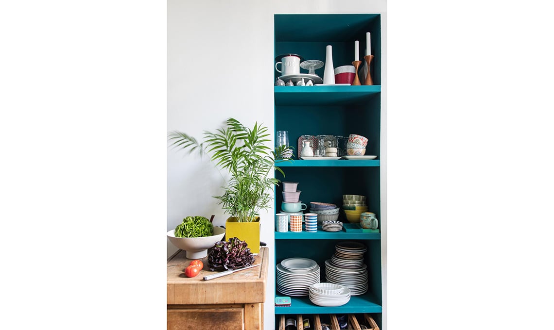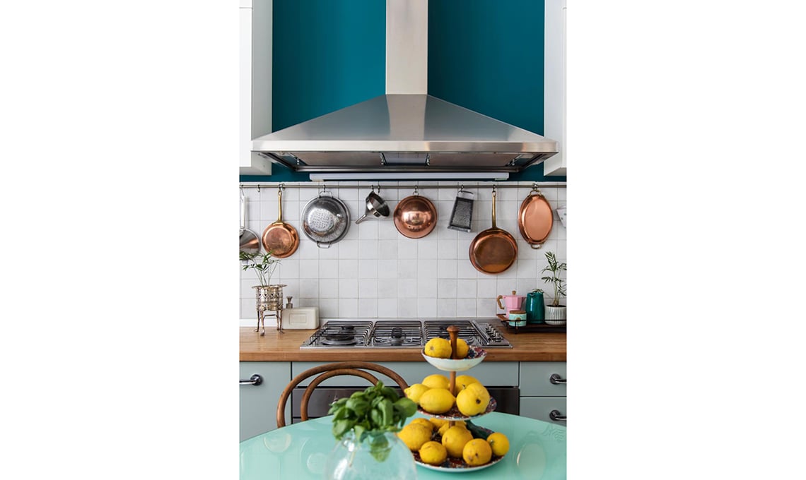 La cucina è la stanza che ha subito il maggiore cambiamento. Prima era piena di colori: rosso, lilla, arancio... Colori vitaminici che però avevano stancato Clara (anche se ci hanno messo anni a farlo! «Non è detto che i colori forti stanchino velocemente» dice). Aveva bisogno di colori meno stimolanti: ora la palette bianca, ottanio e verde salvia ha trasformato del tutto l’ambiente. Bella l’idea di aggiungere colori caldi inserendoli