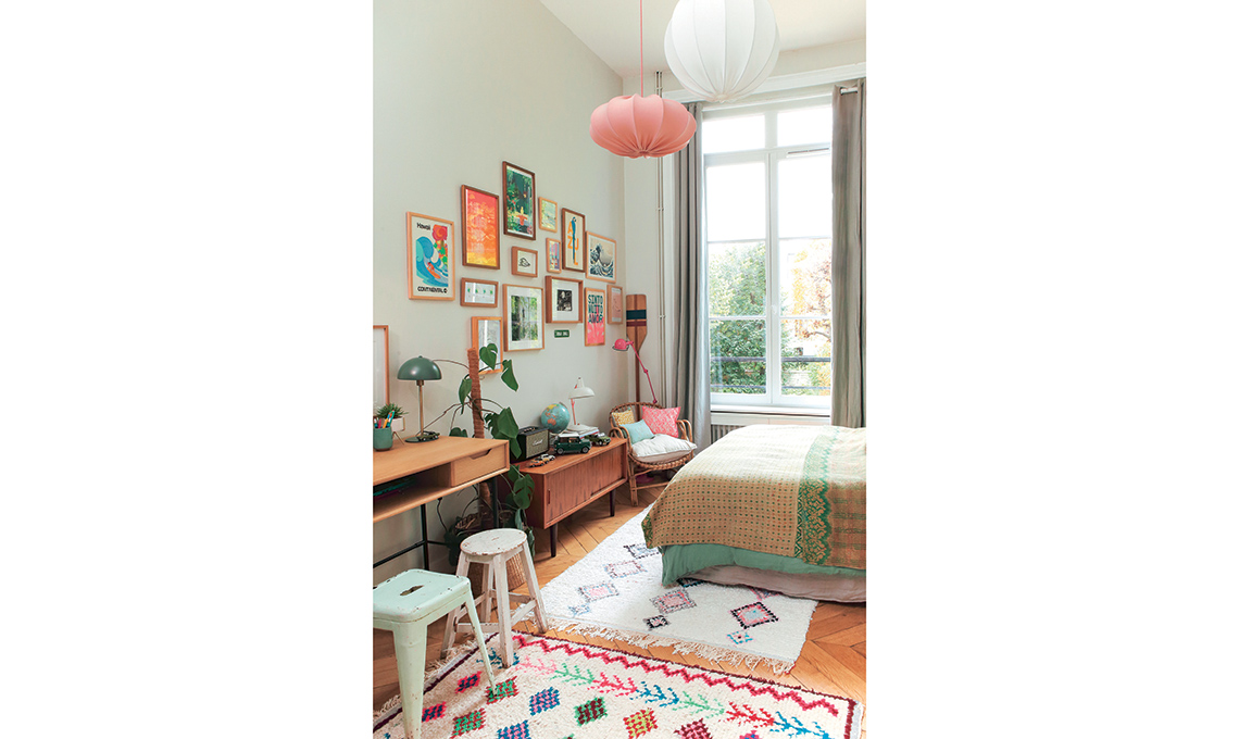 Nella camera di Lilou il focus d’attenzione è su gruppi di piccoli quadri radunati di fronte al letto. Se cerchi lampade in tessuto come quelle qui sopra, puoi guardare modelli Balloon [Bolia] e Beau [Westwingnow] e la collezione Nelson Bubble [Herman Miller]. Sgabello Tabouret in acciaio, vintage [Tolix].