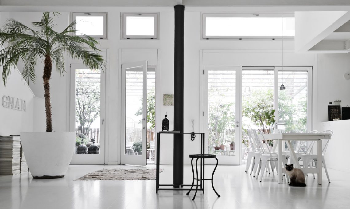 Dal divano la vista si allunga sulla zona pranzo e sul patio esterno: il bianco è quasi totale, interrotto dalla palma esotica. Il parquet? Un parquet candido e lucido.