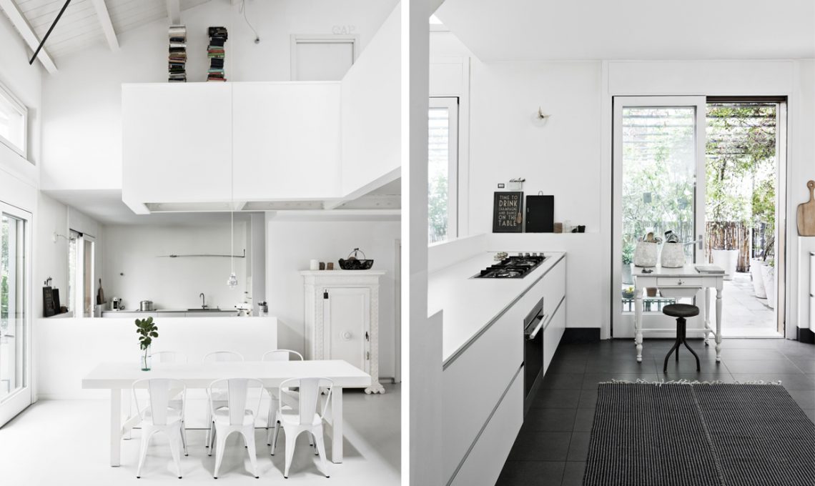 La cucina c'è ma non si vede, ben schermata dietro una muratura che raddoppia il volume architettonico del ballatoio. L’insieme è un’immaginaria scatola bianca che lavora di pieni e vuoti, di altezze slanciate e ribassamenti intimi, di chiaroscuri appena sfumati sulle pareti immacolate.