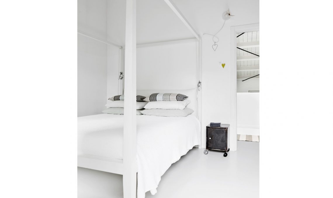 Nella camera da letto il baldacchino è minimal [Orizzonti]. Altri dettagli di stile? La biancheria di lino, il comodino industrial e la poetica applique Lucellino di [Ingo Maurer €330].