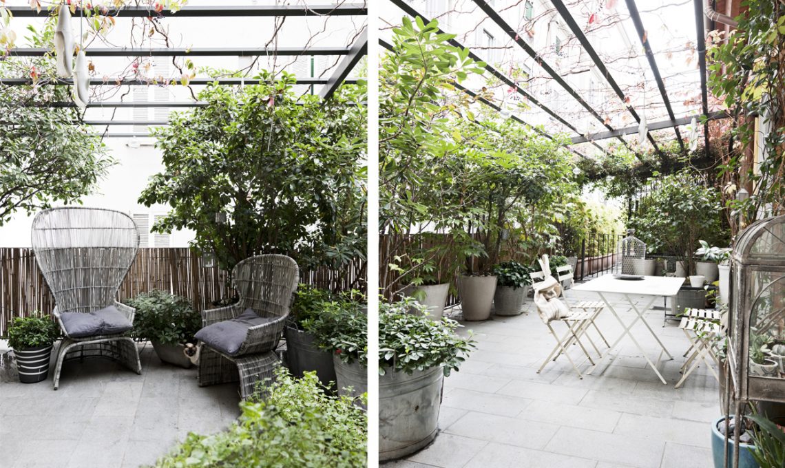 Urban Jungle, il patio è una ‘membrana’ verde che separa la casa dal mondo esterno: gli arbusti più vigorosi si arrampicano sul pergolato e in primavera formeranno un tetto vegetale. Arredi intrecciati in abaca di Patricia Urquiola mod. Crinoline [B&B Italia] sono le indiscusse protagoniste. Le arelle incannucciate sono uno spunto low-budget che fa subito ’scenografia’. Tavoli e sedie in stile bistrot [Ethimo].