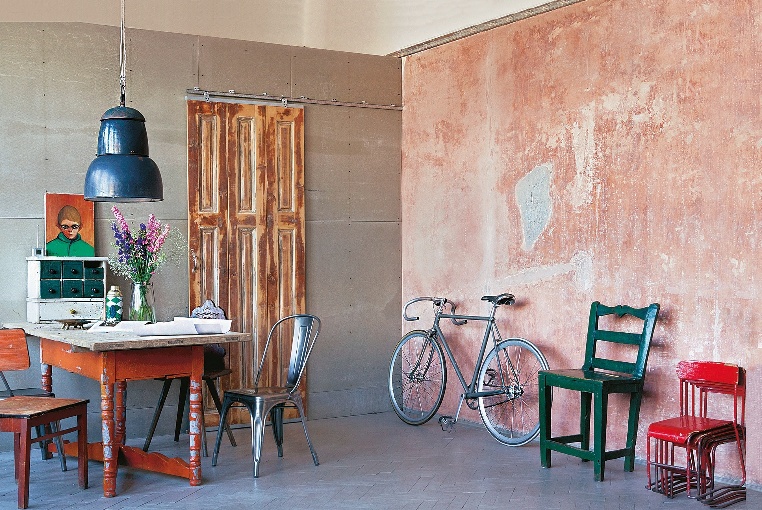 Il pranzo, al centro dell’appartamento, esprime l’amore per lo stile country. Mentre il lampadario e la piantana hanno un carattere industriale, come le sedie in metallo [Tolix, cm 44x51,5x85h, €255].