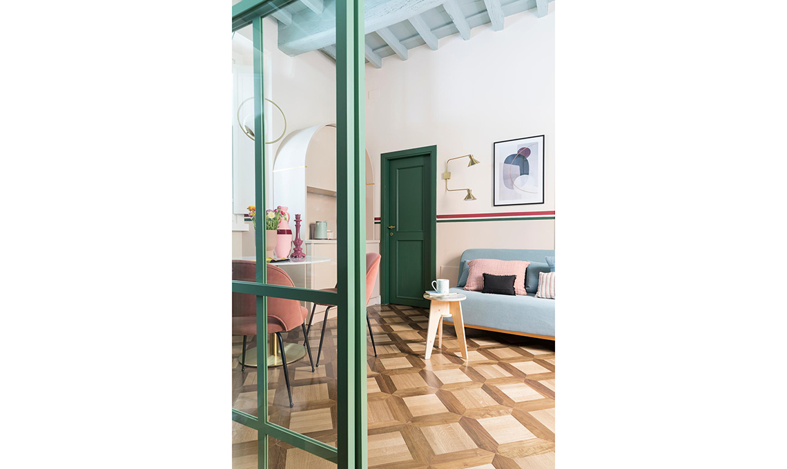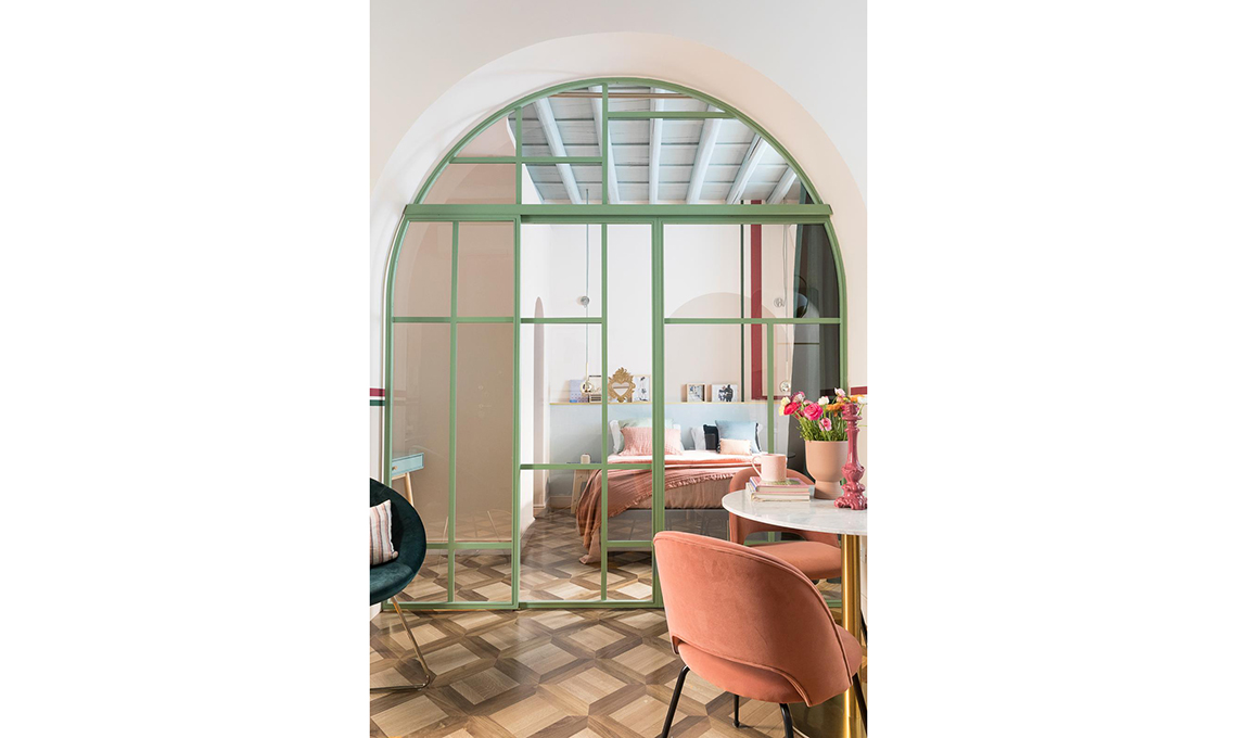 L'arco tra le stanze è emerso con la rimozione di un cartongesso: da qui l’idea di incorniciarlo con una vetrata, che crea una prospettiva