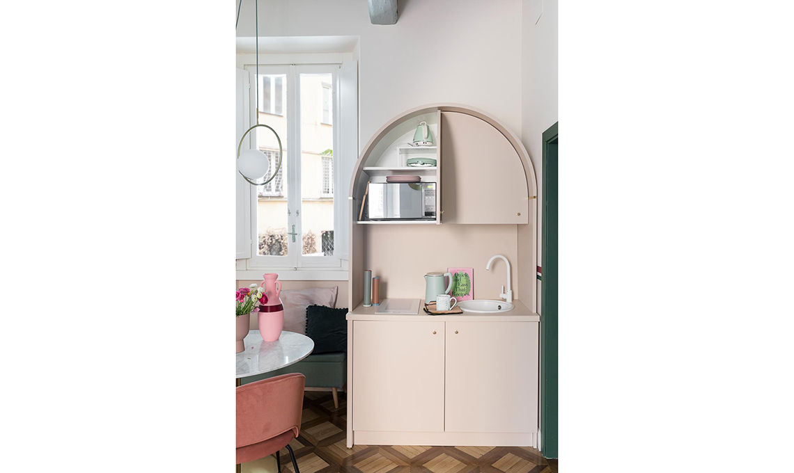 Due stanze aperte ma piccole, dove era problematico inserire i soliti mobili per cucinare e contenere. Ecco allora che ogni cosa, ridotta all’essenziale, trova spazio in un mobile su misura. In alto, dietro le ante curve ci sono due vani contenitivi; al centro, il piano a induzione e il lavandino circolare, bianchi per non impattare sul rosa; le due ante grandi nascondono frigo e pattumiere.