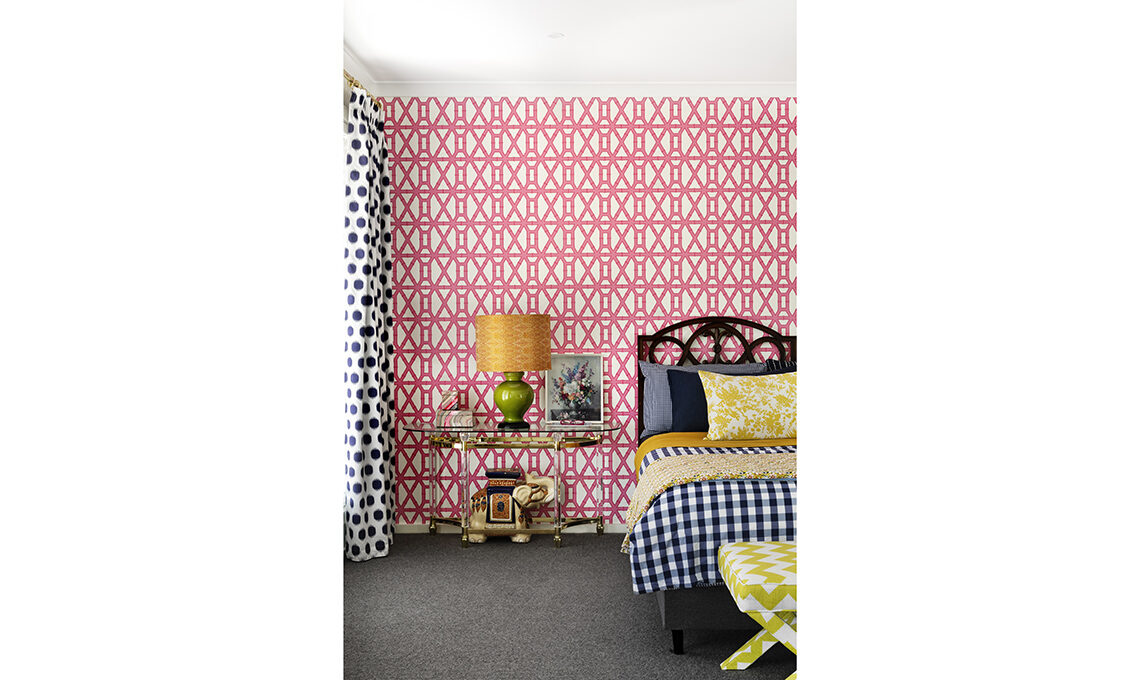 Wallpaper con grafica a traliccio della collezione Bamboo nella variante colore pink [Clairebella Studio]. sgabelli X-Bench con rivestimento in tessuto [Jonathan Adler].