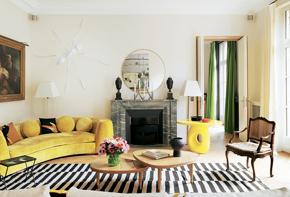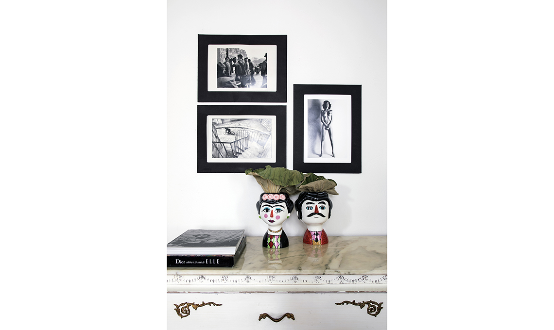 Trovi un tavolino in ottone dorato simile a questo su [brighterhome. it, ø cm 45]. Per poltroncine in rattan che ricordano il modello della foto, visita i siti [maisons dumonde.com, sklum.com e it.casashops.com]. Console in metallo Edwin [Maisons du Monde], vaso a forma di mano [Bitossi Home].