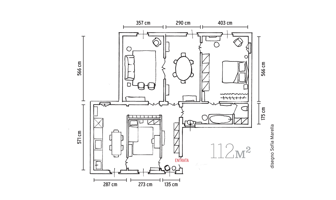 Poltroncine Campanula originali, design Carlo Pagani, comprate da [Magazzino 76], console bianca di recupero [simili su deghishop.it e loberon.it], lampada da tavolo Nesso [Artemide, ø cm 54]. Il tappeto è un kilim moderno: