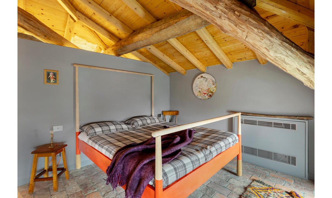 bagno e una cabina armadio. Gli spazi sono stati lasciati senza porte. Le travi