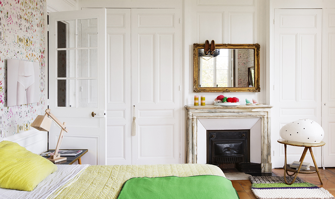 In camera lo stile minimal-creativo bilancia quello solenne e antico di doppie porte e camino. Tappeto Mangas di Patricia Urquiola [Gan], effetto handmade come la sospensione con paralume nero [simile di Ay Illuminate]. Sul tavolino, lampada a pois [La cerise sur le gâteau]. La poltrona vintage [simile Ekenäset, Ikea, €169,90].