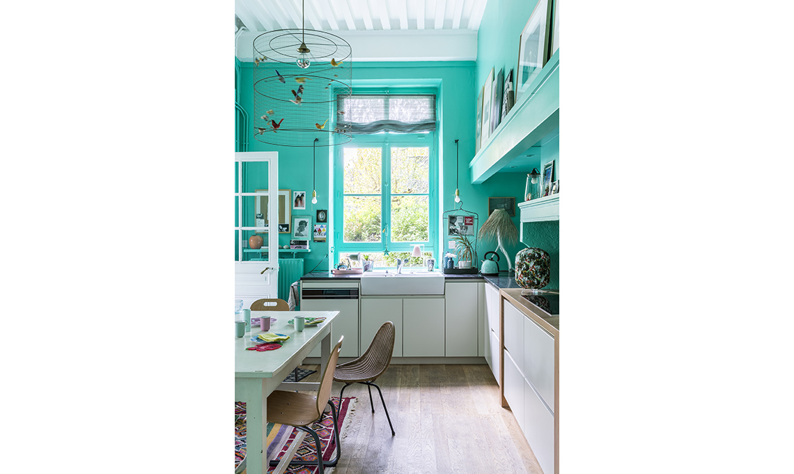 Colore smeraldo [Ressource] accostato al bianco dei sottopensili (e del living, a vista). Lampadario Grande Volière [Mathieu Challières, ø cm 66x66h €660]. Ai lati della finestra, due luci [simili Cb0150 di House Doctor].
