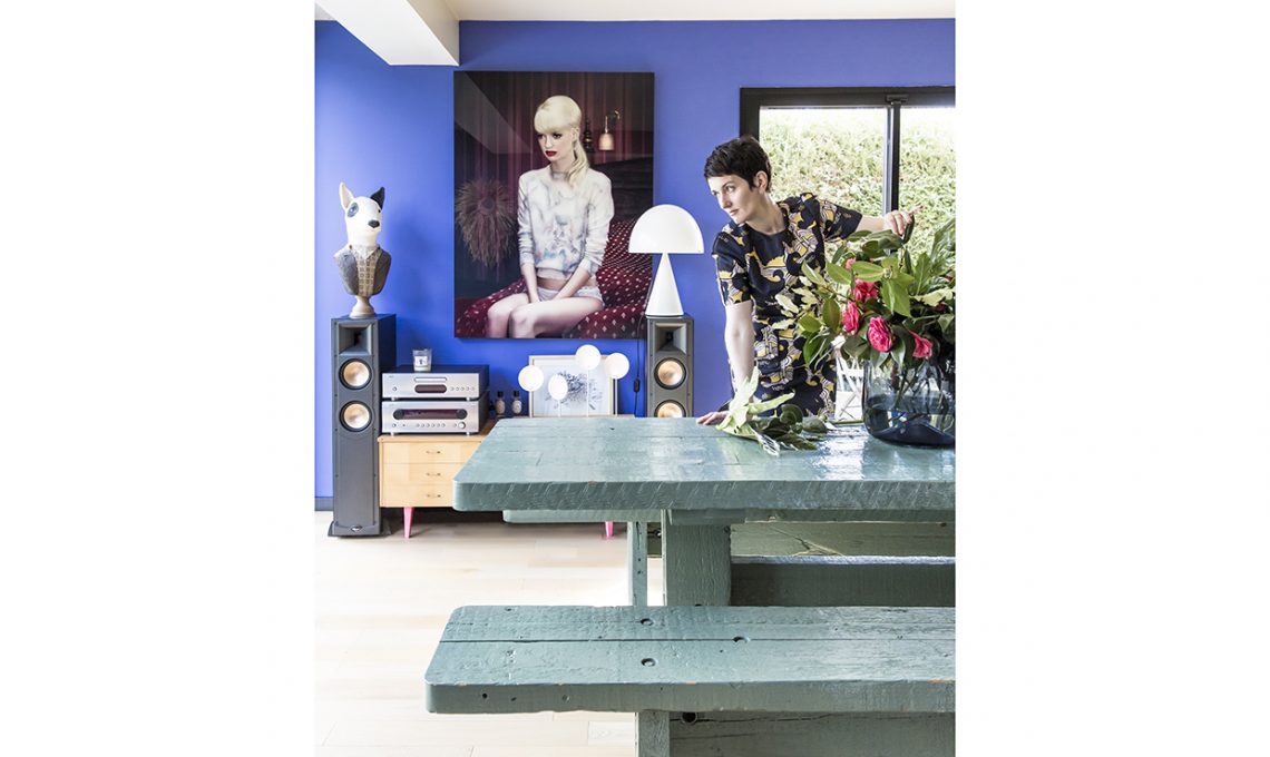 L'artista Pascale Nivet al tavolo da pranzo. Scultura [Muse et Homme] e lampada vintage. Sulla cassettiera, lampada Parabola [Julien Vidame, €545]. La parete blu valorizza la maxi-foto di Erwin Olaf.