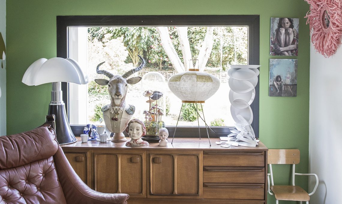 Sulla madia stile Fifties [Roche Bobois], da sinistra: lampada Pipistrello disegnata nel ’65 da Gae Aulenti [Martinelli Luce €1.268,80]. Scultura in cartapesta con testa di animale [Muse et Homme], campana di vetro con funghi, lampada in carta washi Akari, di Isamu Noguchi [Vitra], scultura di Julien Vidame.
