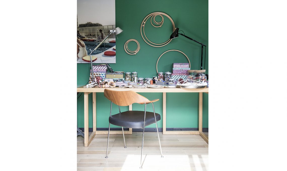 Nell’atelier, perle e fili sono ordinati in scatole e vasetti. Sedia Anni ’50 di Robin Day [Habitat come la scrivania e la lampada nera]. A sinistra, lampada Tolomeo [Artemide]. I cerchi da ricamo qui diventano decoro!