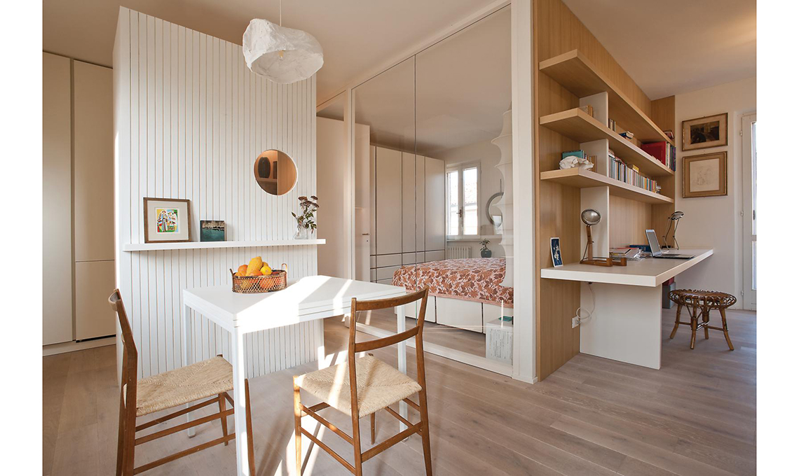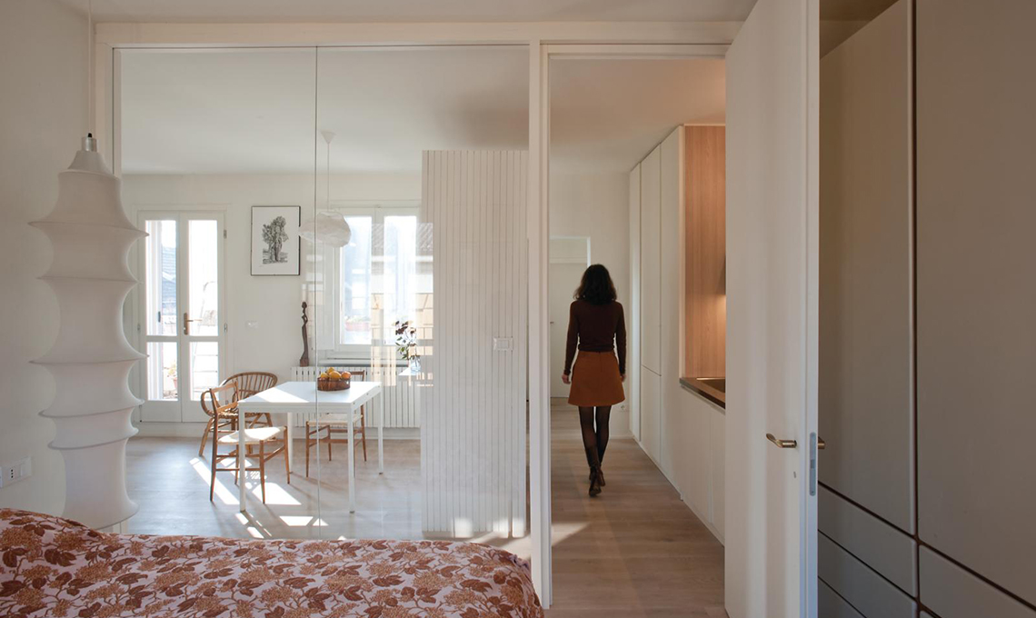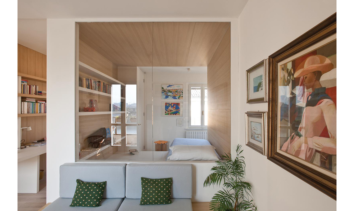 «La casa era divisa in tante stanze piccole e buie, ma il doppio affaccio Nord - Sud ci ha spinti a osare: abbiamo proposto di sostituire i muri con pareti in parte di legno e in parte di vetro» dice l’architetto. «Ora la luce corre senza ostacoli tra i due affacci».