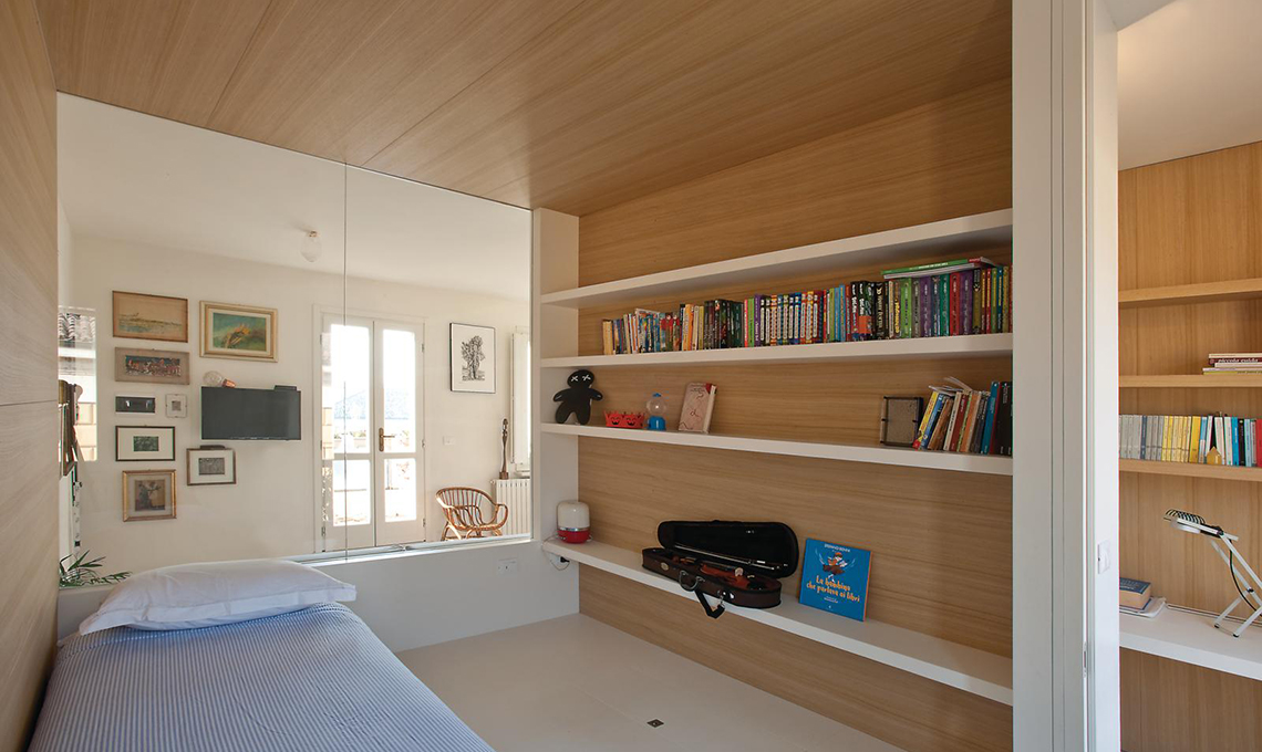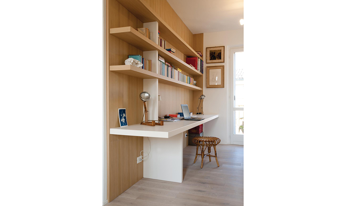 opposti della casa. L’unico tramezzo in muratura rimasto in piedi è quello che divide la camera padronale dallo studio: per sfruttarlo con una libreria importante senza caricarlo con un peso eccessivo, dato che era ‘fragile’, è stato rivestito con una boiserie in lastre di rovere alla quale è fissata la struttura di libreria e scrivania realizzate su disegno. Questo sistema consente all’insieme di scaricare i pesi a terra. A contrasto: Il piano scrivania, la gamba e i montanti verticali sono stati laccati in bianco come i muri perimetrali.