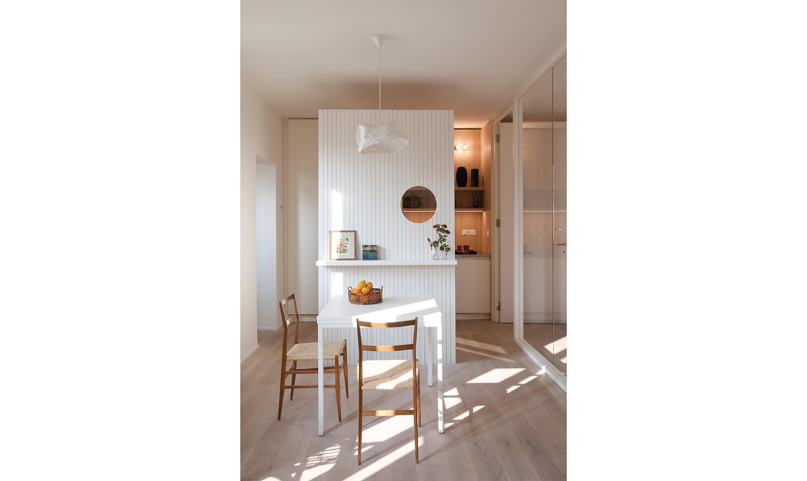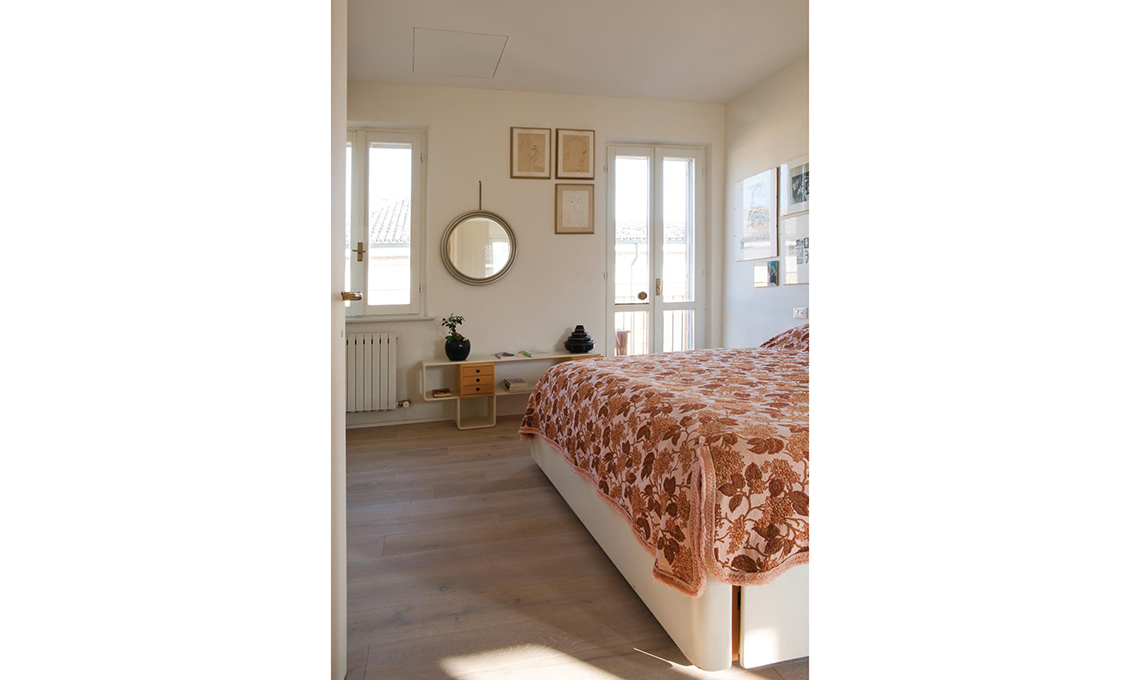 Arredi e infissi sono in bianco e in rovere naturale o sbiancato: una scelta che aiuta a dare ordine dove le stanze sono a vista.