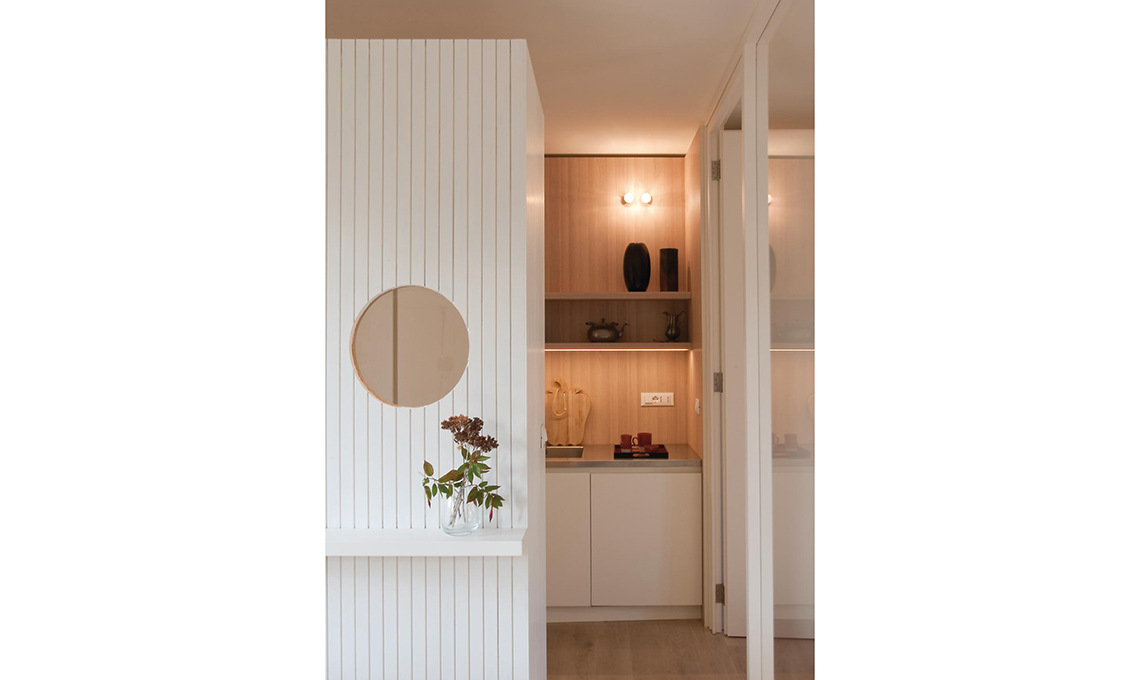 Il rivestimento a doghe verticali dona un tocco décor tridimensionale alla quinta che nasconde la cucina.
