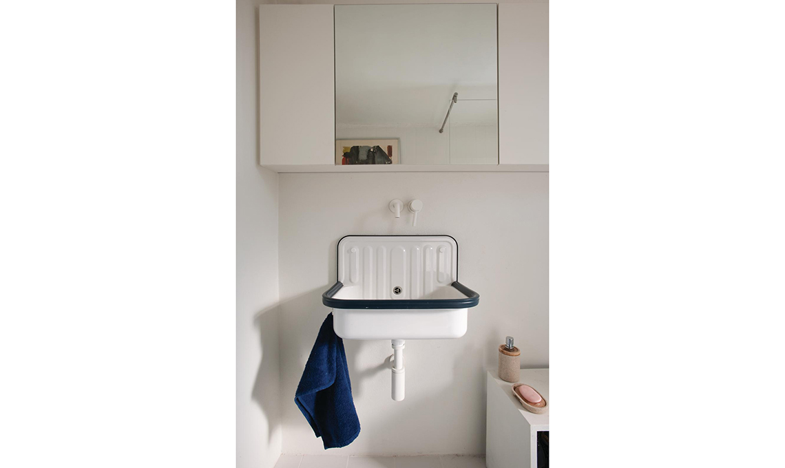 In bagno un pensile a profondità ridotta è l’idea storage da copiare. Sopra il lavabo sospeso AG.Stahlform in acciaio smaltato bianco e nero [Alape, cm 51x36x36,5h] c’è una fila di pensili super contenitivi anche se a profondità ridotta, realizzati su misura.