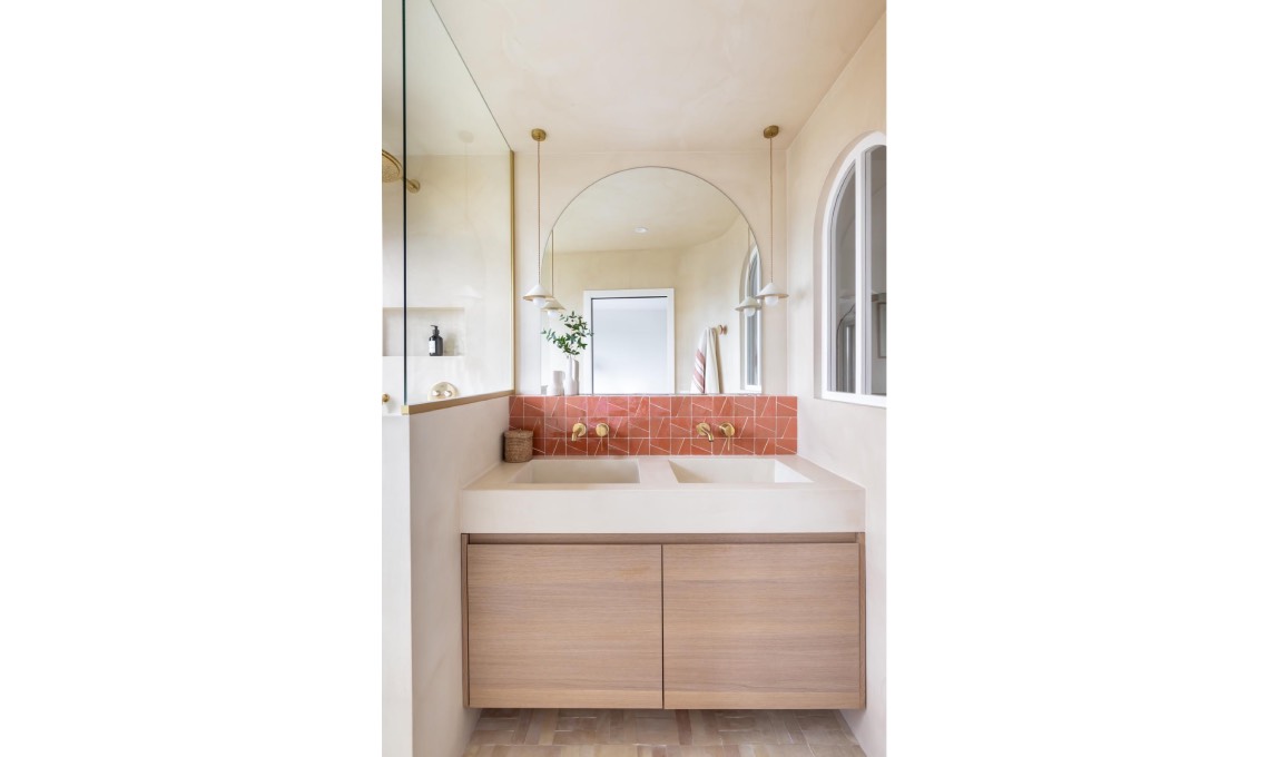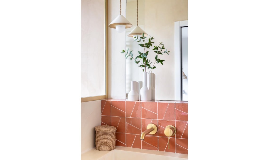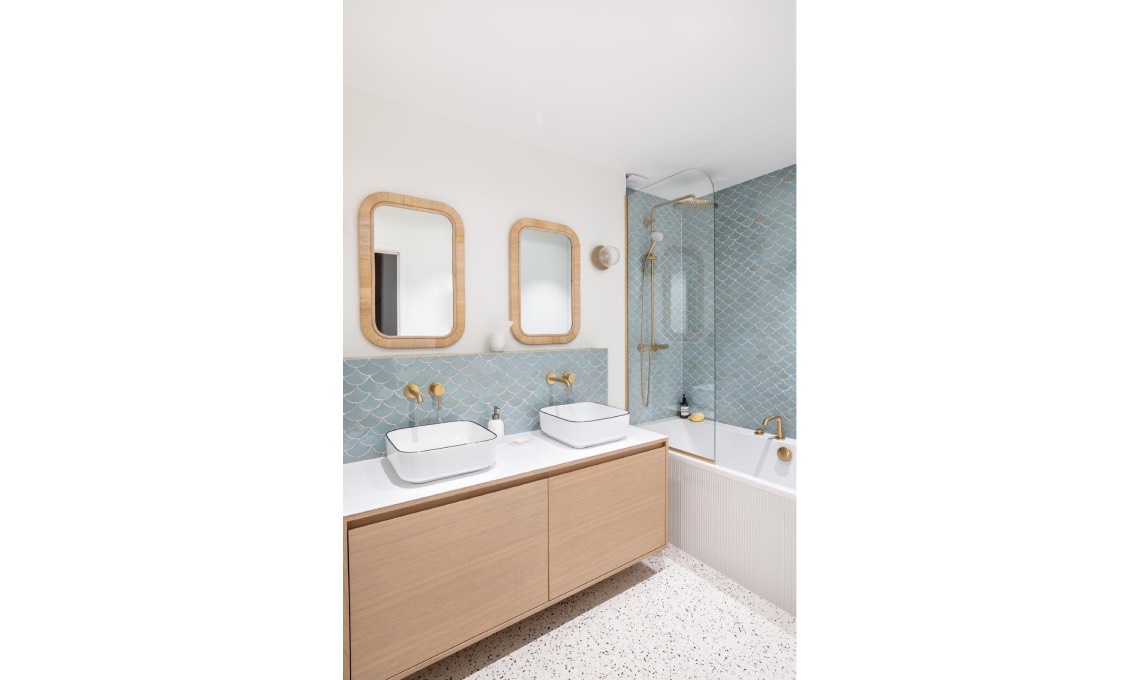 sospeso con doppia vasca d’appoggio. Piastrelle zellige formato Fish