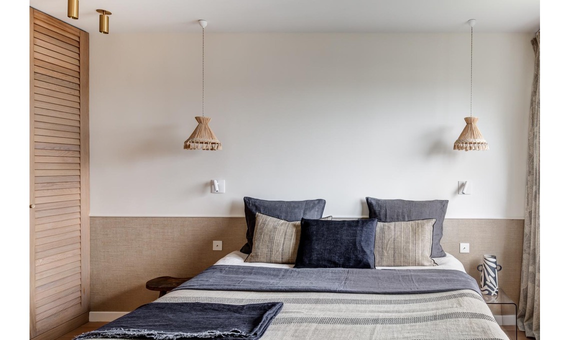 La palette base dai toni neutri è accesa dai tocchi di verde salvia, dagli azzurri delle zellige e dal terracotta. Gli arredi? Un mix di pezzi di design, vintage e su disegno.