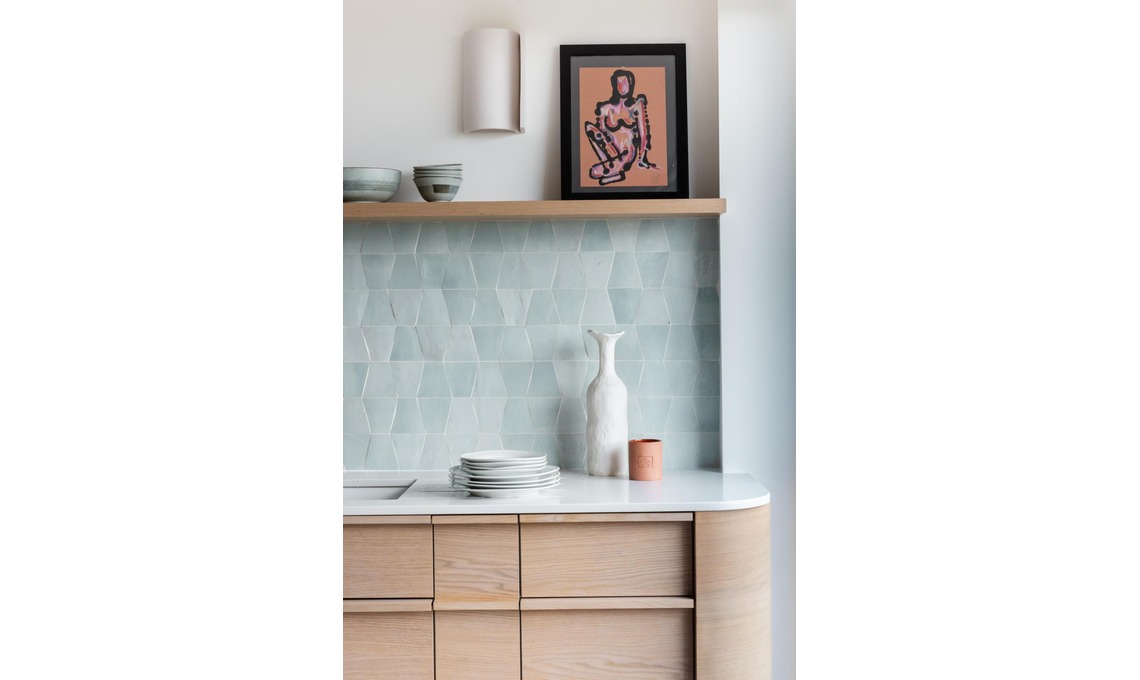della cucina profila i 4 metri di paraschizzi, incorniciandolo. Piastrelle zellige Trapeze L [Mosaic Factory], applique scutura Fragment in ceramica [François