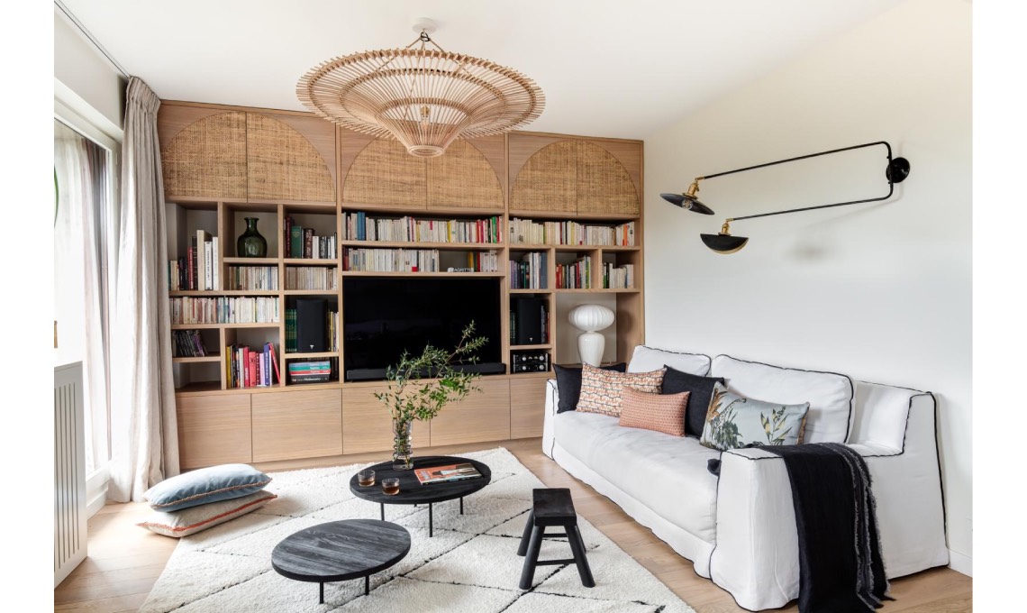 1. La maxi sospensione di rattan è il pezzo clou del living. Basta lei per decorare la stanza. Per evitare il total look, Julie non ha aggiunto altri complementi in stile boho, ma ha deciso di dare soltanto dei tocchi décor alla libreria con gli inserti ad arco in legno di balsa e rafia.