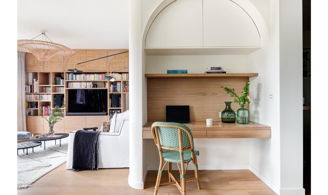 Un design ispirato ai viaggi con cenni boho e l’uso ridondante di linee curve e forme arrotondate ha sostituito il design rigido Anni ’70 che caratterizzava gli spazi. La vetrata décor ad archi, la nicchia alcova, l’ufficio ritagliato all’ingresso e l’armadio del living giocano tutti con le curve.