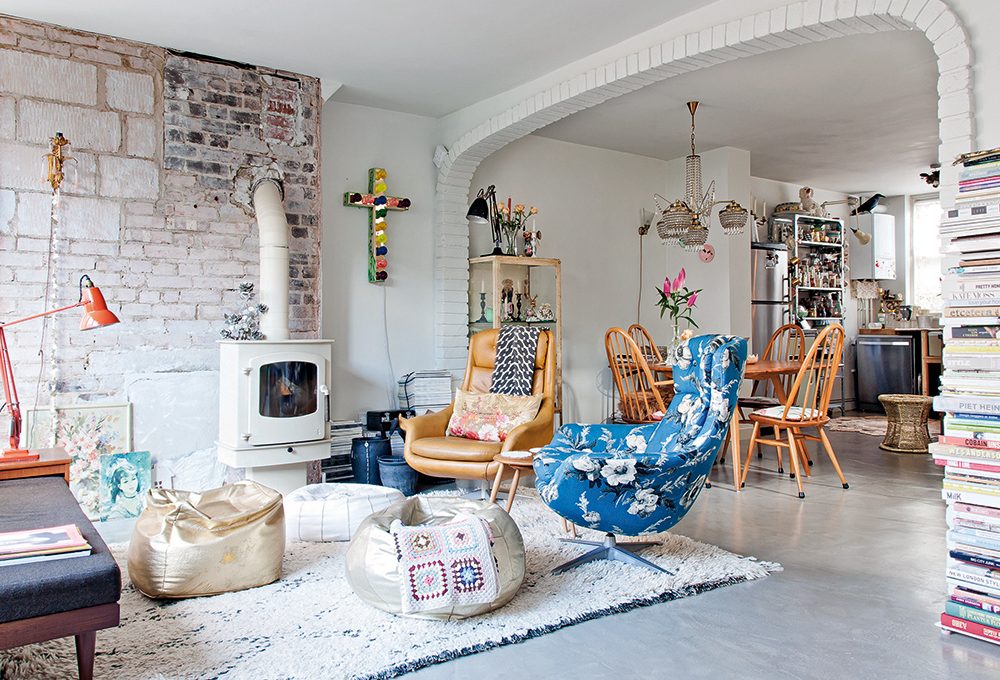Sul divano Stockholm di velluto verde bottiglia [Ikea], un mix di cuscini colorati [Svenskt Tenn, H&M Home, Åhlens e Ikea]. La poltrona Anni ’50, scovata in un mercatino, è stata rivestita da Clara con il tessuto Willow Bough [William Morris]. Sul tavolino vintage, la collezione di portacandele di Clara [Skultuna, H&M Home, Voluspa].