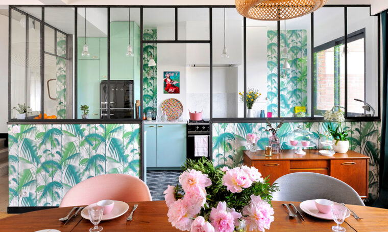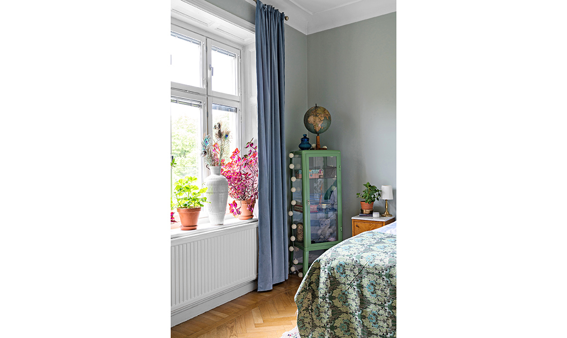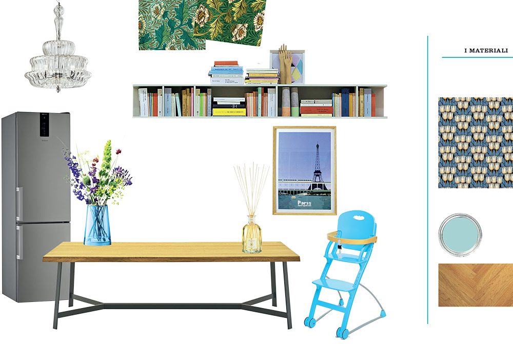 La scala dei verdi salvia e degli azzurri tenui, scelti nelle tonalità polverose, si abbina alla perfezione ai tessuti e alle wallpaper vintage dalle fantasie floreali o dai decori jacquard.