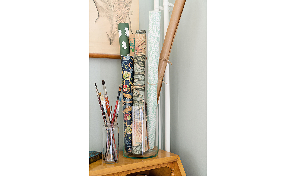 Sul secrétaire a ribalta, gli avanzi delle wallpaper arrotolati in un vaso di vetro diventano un soprammobile chic!