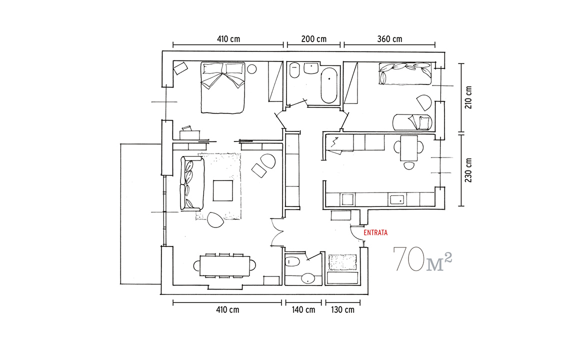 La nicchia attrezzata: dipinte di bianco, sembrano scomparire sulla parete. Fanno il paio con i cappelli di paglia, i cesti scovati in un suk a Marrakech. Verde prato l’armadietto per le chiavi, ereditato.