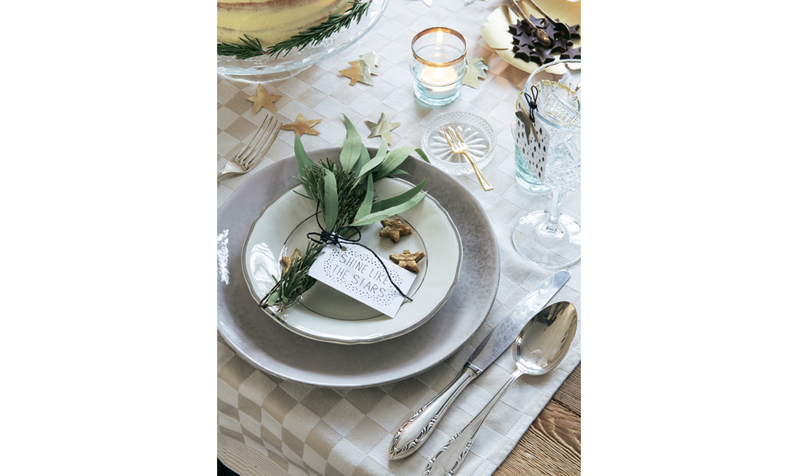 Sulla tovaglia damier in bianco, una pioggia di stelline dorate