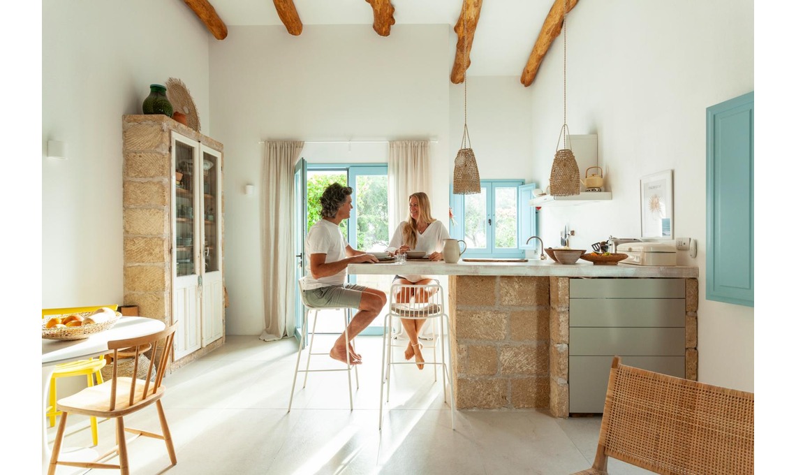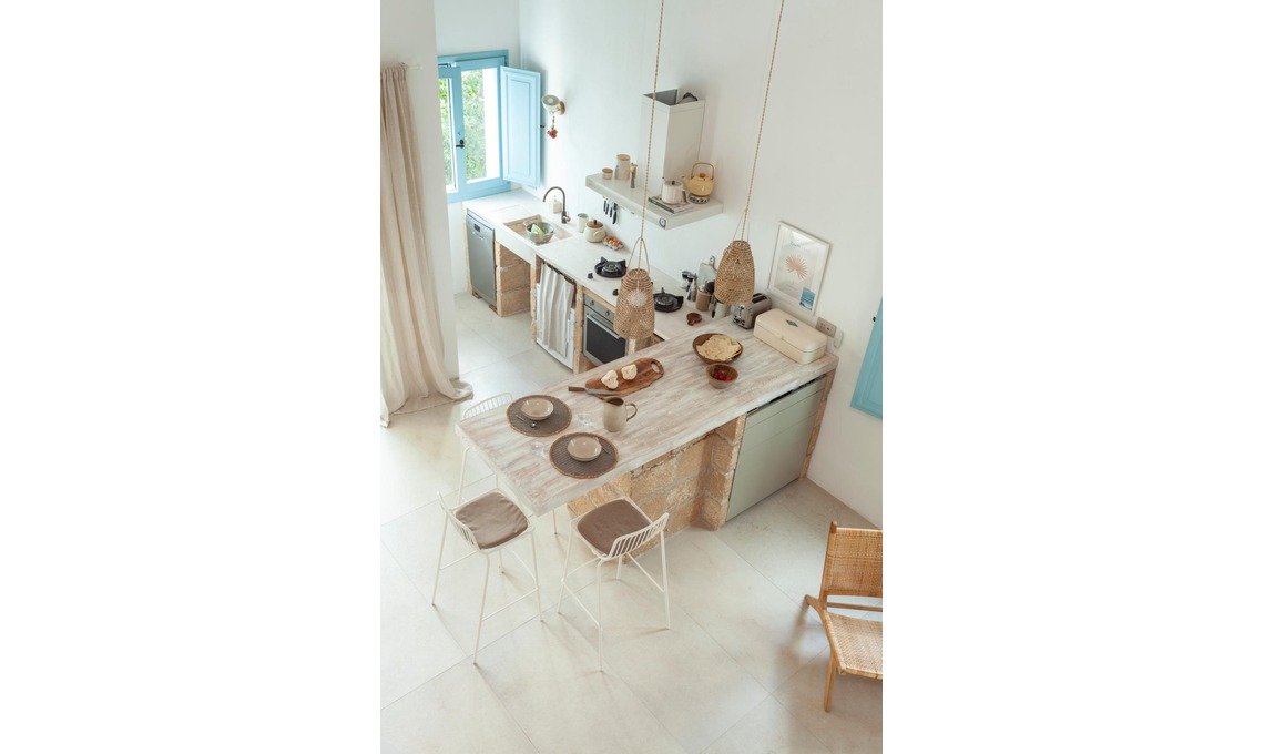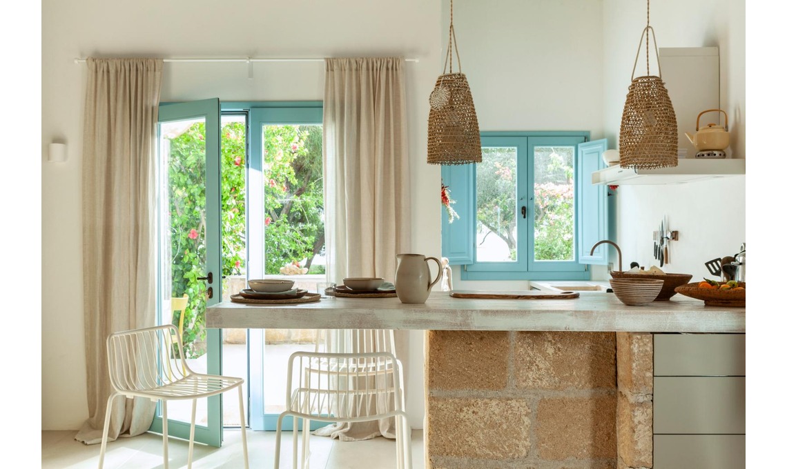 «L’ispirazione per i materiali? Artigianato locale e materiali naturali. Il piano della cucina e i davanzali delle finestre sono realizzati con una bella pietra locale, il Biancone di Orosei. Abbiamo deciso di acquistare le lampade dal nostro vicino di casa, un pescatore in pensione che produce ancora