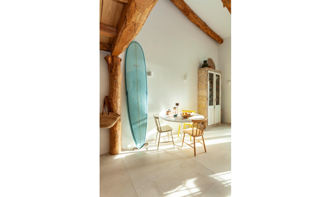 Non c’è posto per la tavola da surf? Appoggiata alla parete diventa un oggetto décor. Tavolo Tulip, design Eero Saarinen [Knoll], sedie simili a J Series 77 [Hay] e J46 by Poul M. Volther [FDB Møbler].