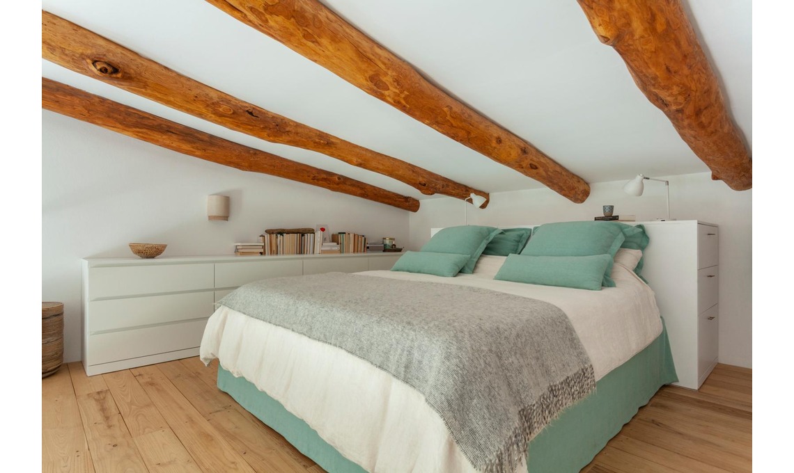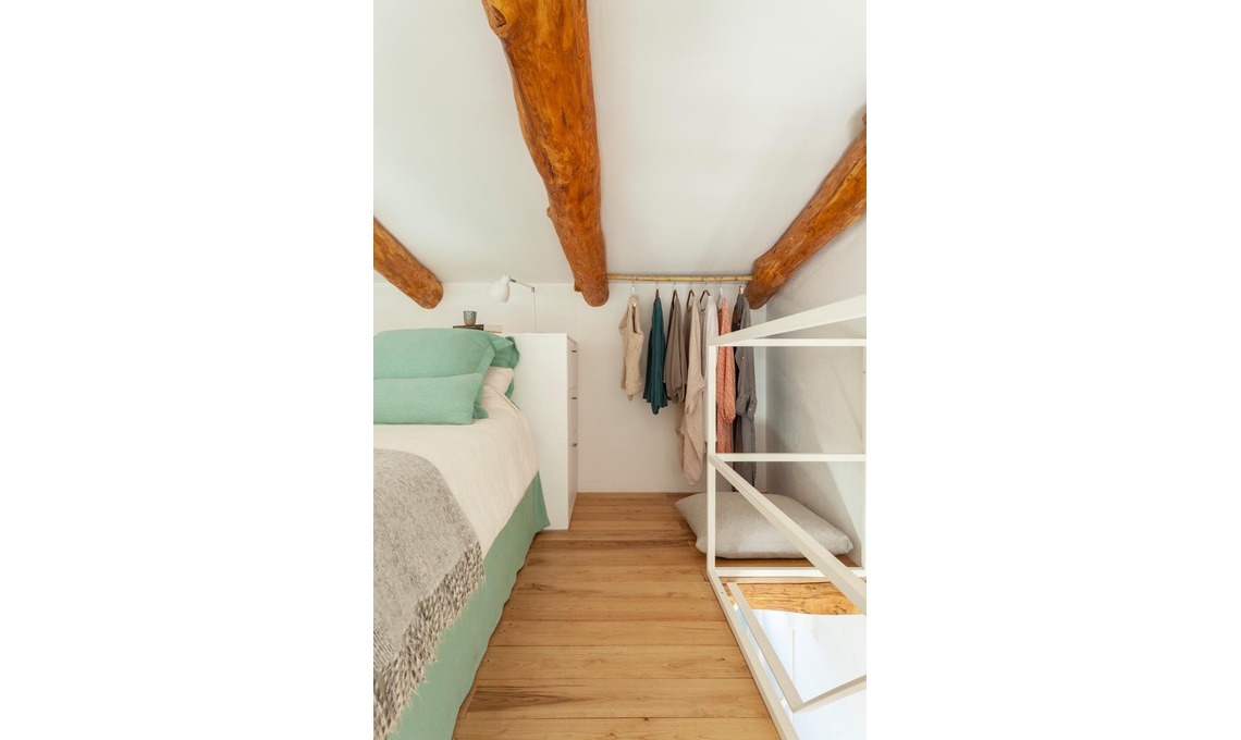 In camera da letto, a vista sul soppalco: cassettiere Malm a 6 cassetti [Ikea], stand appendiabiti simile a Rigga [Ikea]. Per un copriletto estivo, cerca nell’ampia collezione Nettare su » fazzinihome.com.
