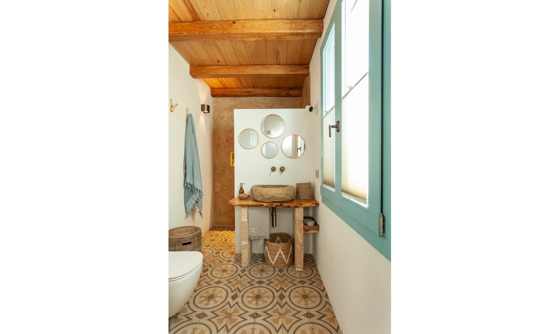Il layout stretto e lungo del bagno è stato ottimizzato prevedendo una quinta muraria che crea una nicchia doccia e su cui si aggancia il lavabo in pietra arenaria (in realtà l’acquasantiera di una chiesa). Sotto, i blocchi di pietra arenaria come quelli usati per costruire la cucina sostengono un piano di legno grezzo e ospitano dei cestini contenitori. Cerchi un grès dall’estetica rétro? Guarda le collezioni di [Nanda Tiles] in vendita anche sul sito » etoffe.com. Il set di 3 specchi rotondi Lacie è su [Westwing].