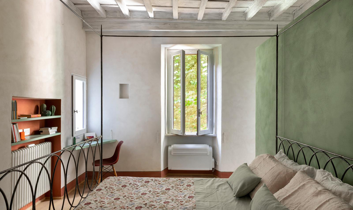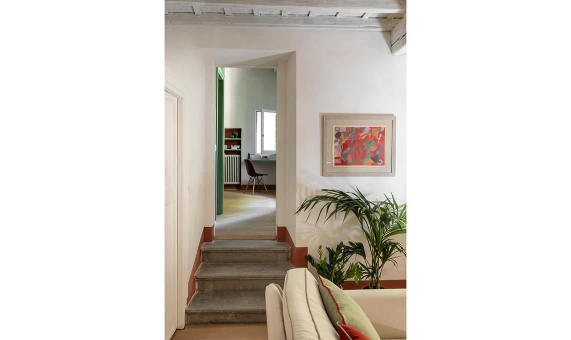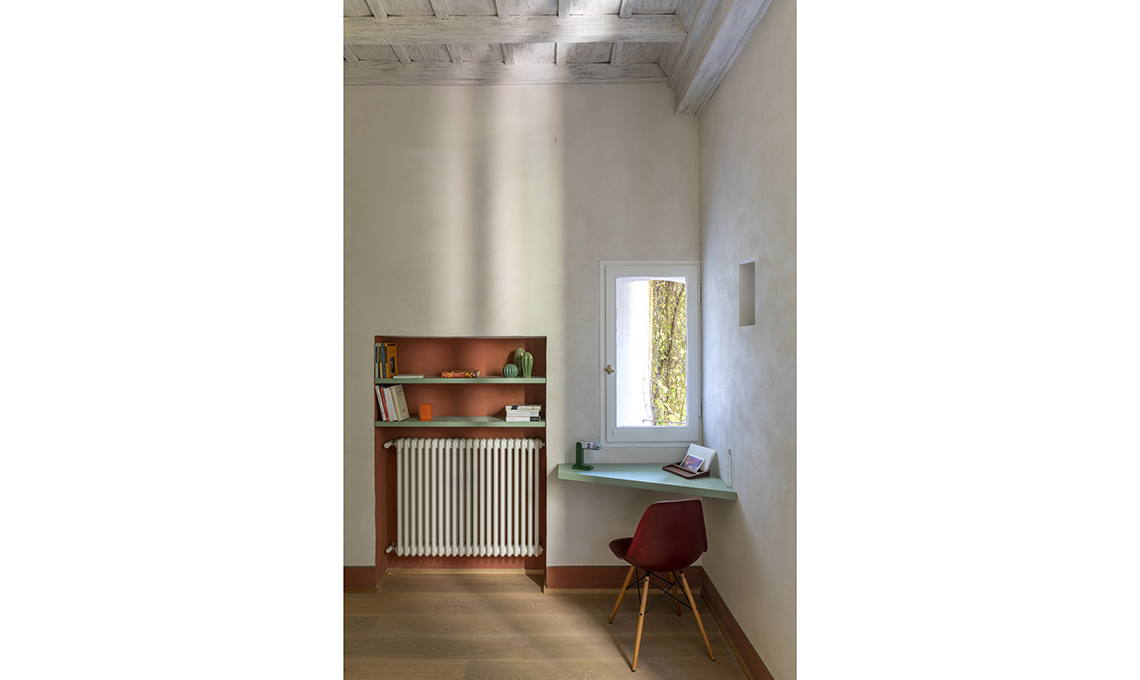 Le pareti ‘irregolari’ sono state tinteggiate con un bianco caldo su intonaco civile, come nel resto della casa, per un effetto non omogeneo.