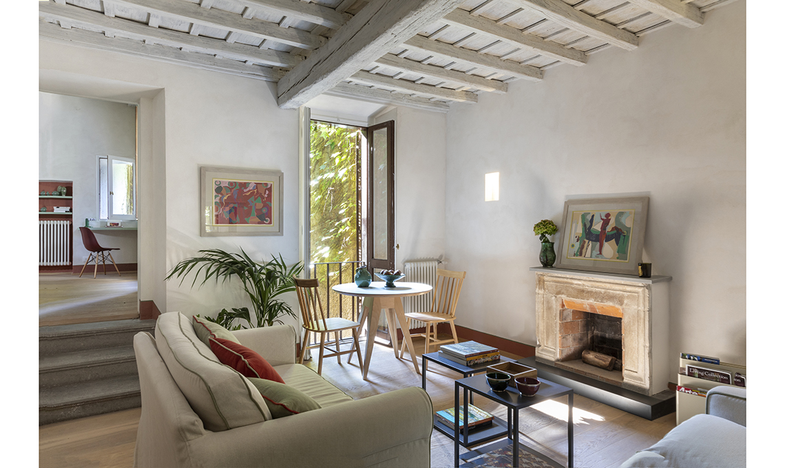 la zona del camino prima dell’intervento. Poltrone con un pesante tessuto damascato, mobili disposti alla rinfusa, travi scure, piastrelle di cotto. L’effetto