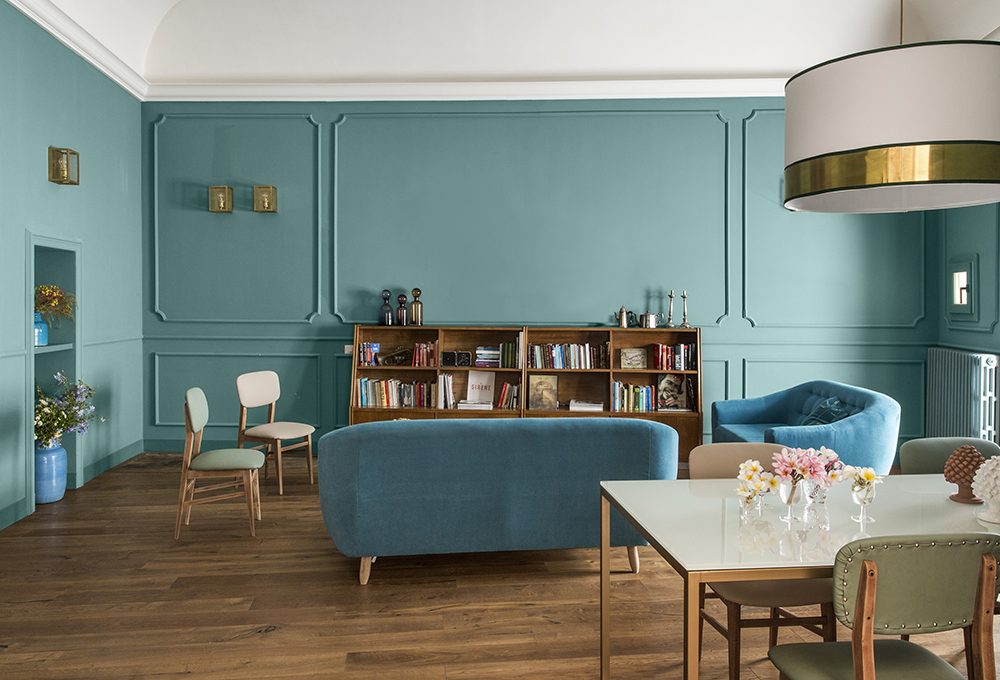 Le pareti del salottino relax sono dipinte con la pittura nella variante colore Babbling Creek [Plascon]. Come Charlotte, ami i mobili realizzati con legni di recupero? Guarda le creazioni di [Algranti Lab], che li propone anche su misura.