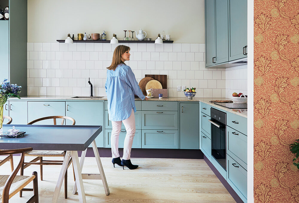 Cucina freestanding [Bertazzoni], lampadario in vetro opalino bianco [Gilles de Moyencourt Haute-Antiques]. Tavolo vintage con piano in marmo e ‘cover’ di vetro [Die Ossewa Antiques].