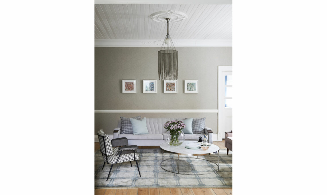 Lampadario chandelier con frange realizzate con serie di catenelle a sfere brunite [Willowlamp]. Coffee table rotondo in marmo [Tonic Design].
