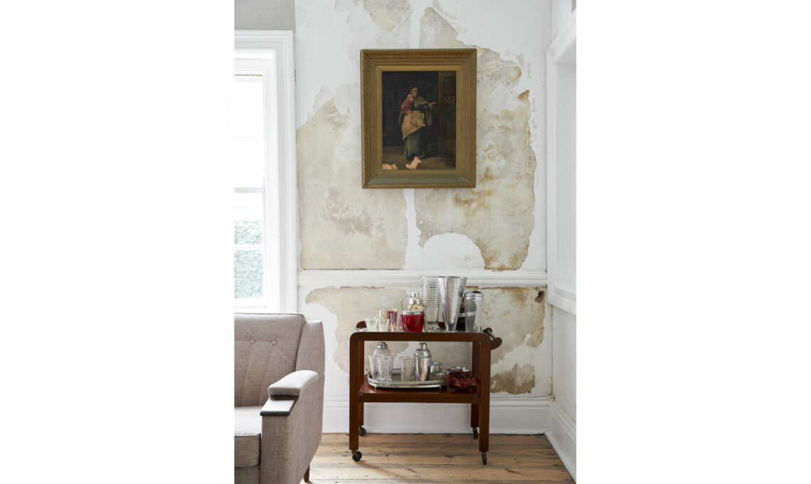 Fuori dagli schemi: Il ritratto di famiglia (senza cornice!) è appeso con un filo al soffitto, proprio davanti alla vetrata! Portafinestra con telaio originale e pannello in legno di recupero [Onsite Gallery]. I mobili sono dipinti con lo smalto opaco colore Garden Seat [Plascon].