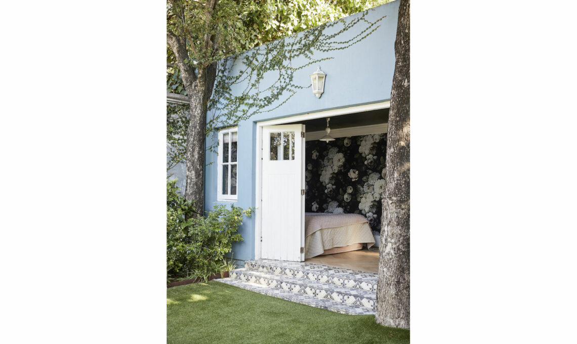 La camera con vista si affaccia sulla piscina così la vecchia sala da biliardo diventa dépendance per gli ospiti. Per far risaltare l’ingresso, Charlotteha rivestito gli scalini con vecchie piastrelle décor. L’effetto è quello di un tappeto!