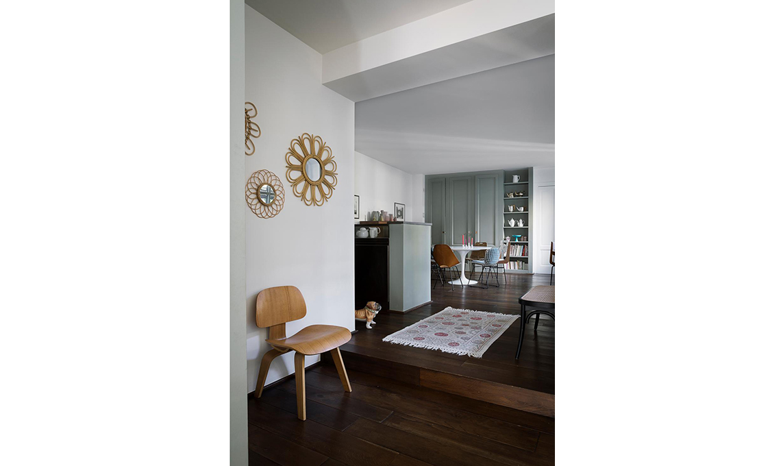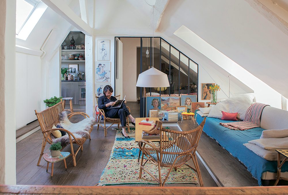 Il parquet che scricchiola, le ampie vetrate, il ballatoio, gli abbaini e la vista su tetti e comignoli. È stato amore a prima vista quello di Sabina per questo appartamento agli ultimi due piani di una casa di ringhiera milanese, affacciata sul Naviglio Grande.