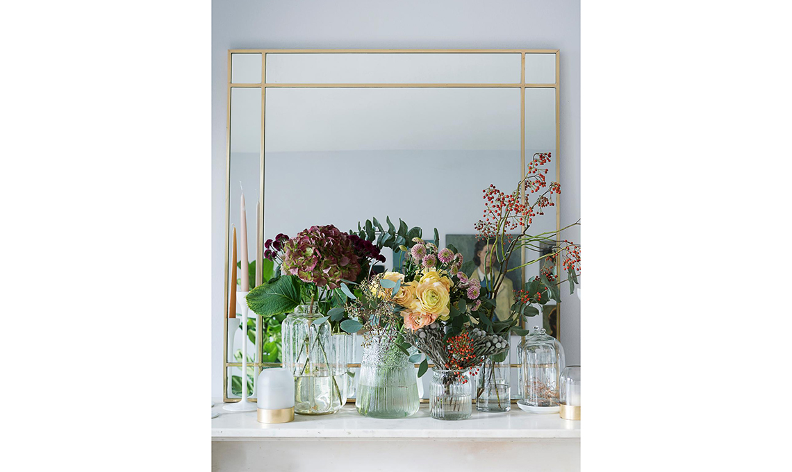 L’austero camino in marmo con lo specchio Mid Century andava decorato. Sabina ha scelto un mix di barattoli vintage in vetro per le caramelle con fiori, rami e bacche. «Mi piace dare una seconda vita agli oggetti di recupero», dice,