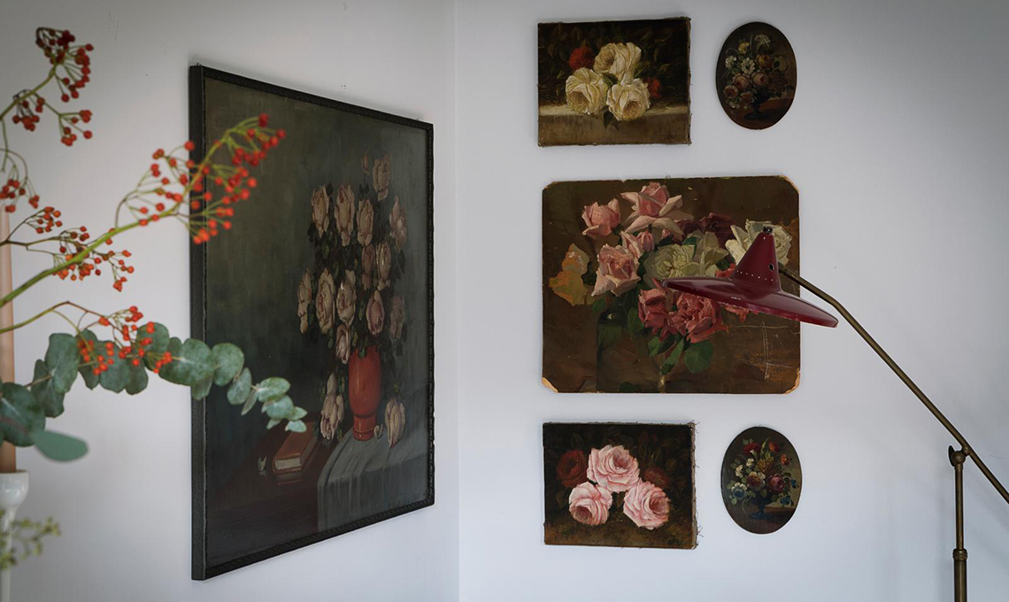 I ritratti a olio e i dipinti di rose francesi dell’800 dedicati alla mamma sono appesi senza cornice. «Molti quadri avevano cornici dorate barocche, ma non è il mio stile», dice Sabina.